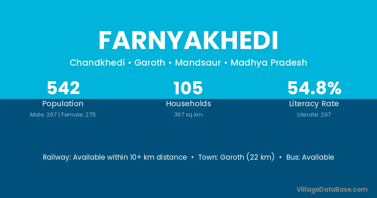Farnyakhedi village has a total population of 542 people, of which 267 are males and 275 are females.