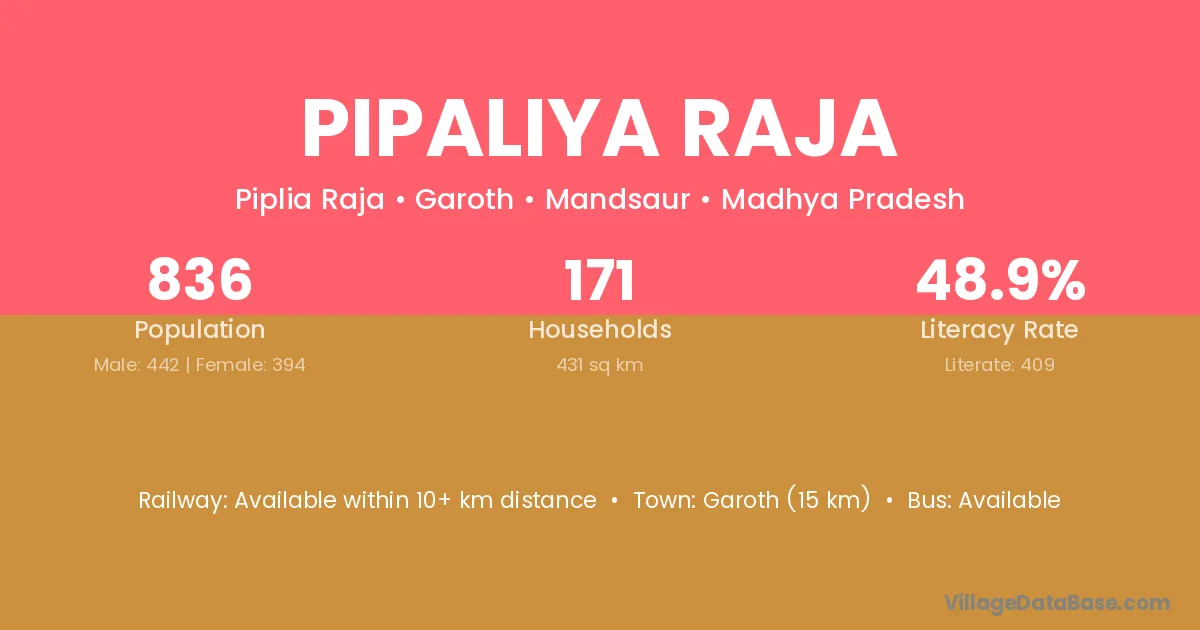 Garoth (15 km) is the nearest town to Pipaliya Raja village for major economic activities and is located approximately 15 km away.