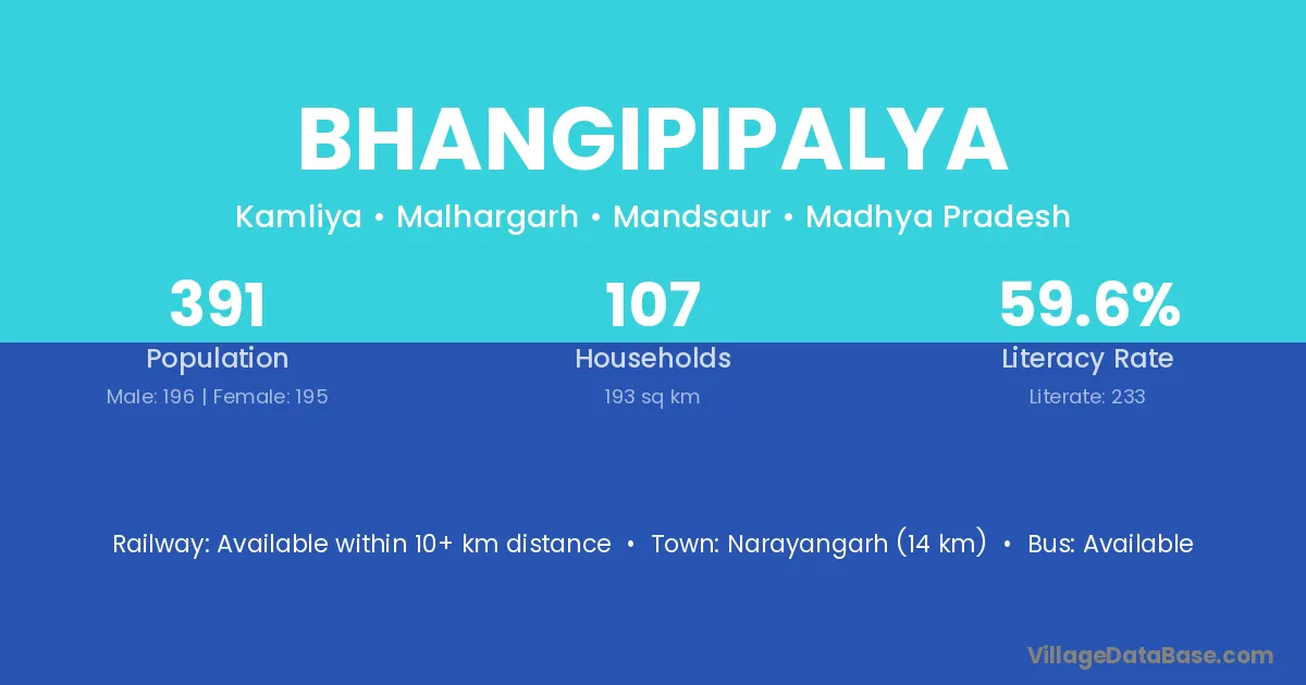 Bhangipipalya village has a total population of 391 people, of which 196 are males and 195 are females.
