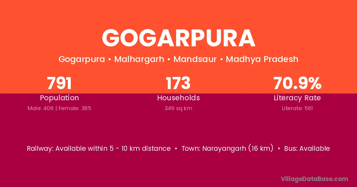 Narayangarh (16 km) is the nearest town to Gogarpura village for major economic activities and is located approximately 16 km away.
