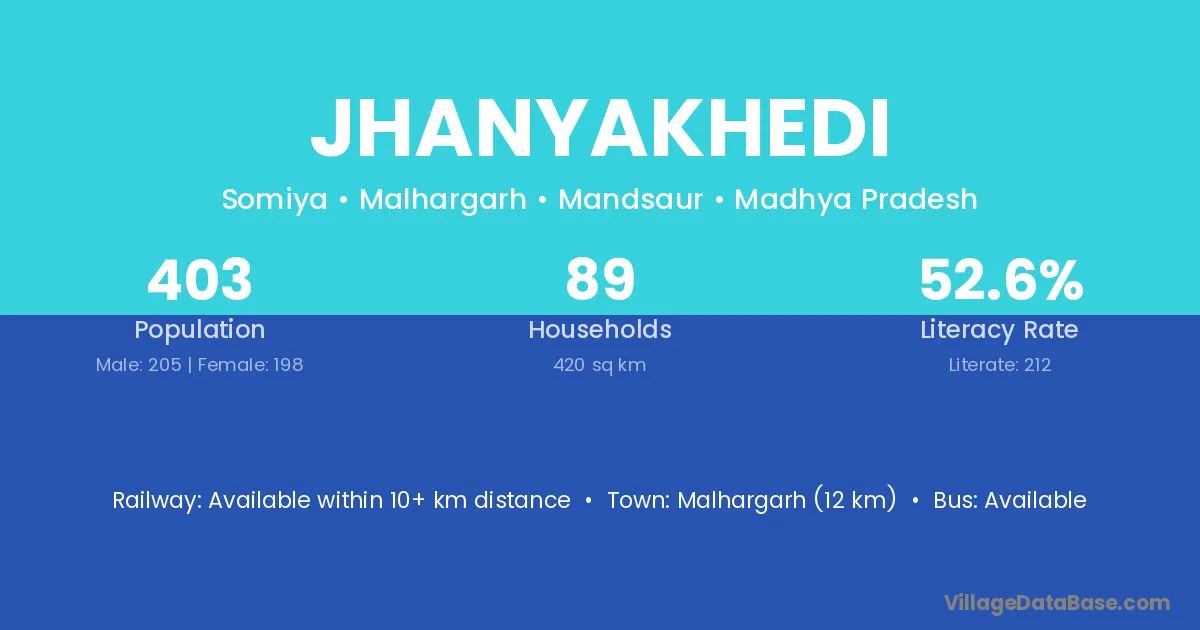 Jhanyakhedi village has a total population of 403 people, of which 205 are males and 198 are females.