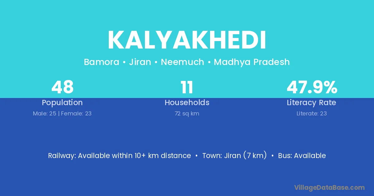 The literacy rate of Kalyakhedi village is 63.39%. Male literacy stands at 80.06% and female literacy at 48.06%.