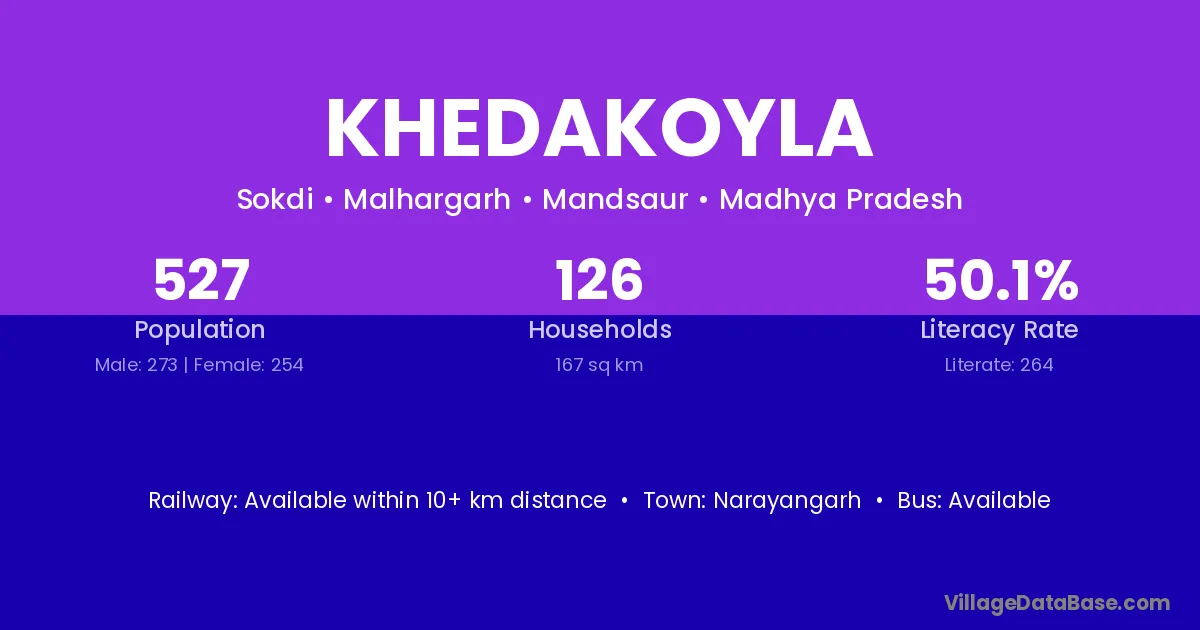 Khedakoyla village has a total population of 527 people, of which 273 are males and 254 are females.