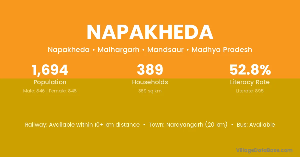Napakheda village has a total population of 1,694 people, of which 846 are males and 848 are females.