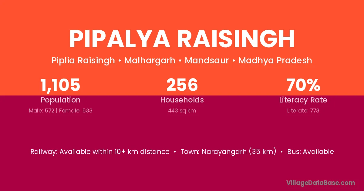 Pipalya Raisingh village has a total population of 1,105 people, of which 572 are males and 533 are females.
