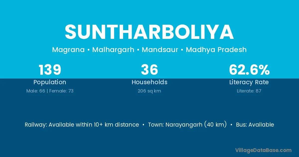 Suntharboliya village has a total population of 139 people, of which 66 are males and 73 are females.