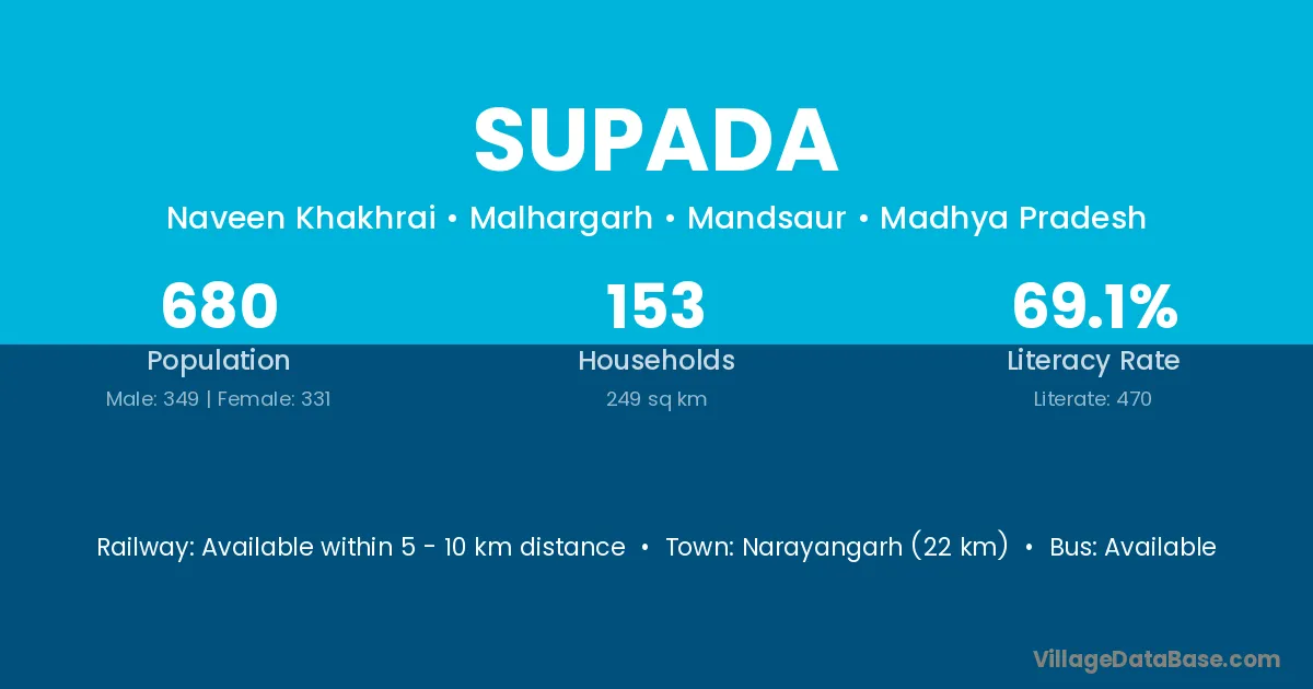 Narayangarh (22 km) is the nearest town to Supada village for major economic activities and is located approximately 22 km away.