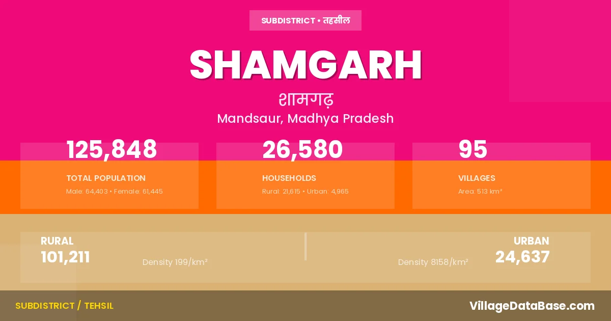 According to the 2011 census The total area of Shamgarh Tehsil is 513 km², with a population of 125848 people. The population density is 245 inhabitants per square kilometre, and there are approximately 26580 houses in the sub district.