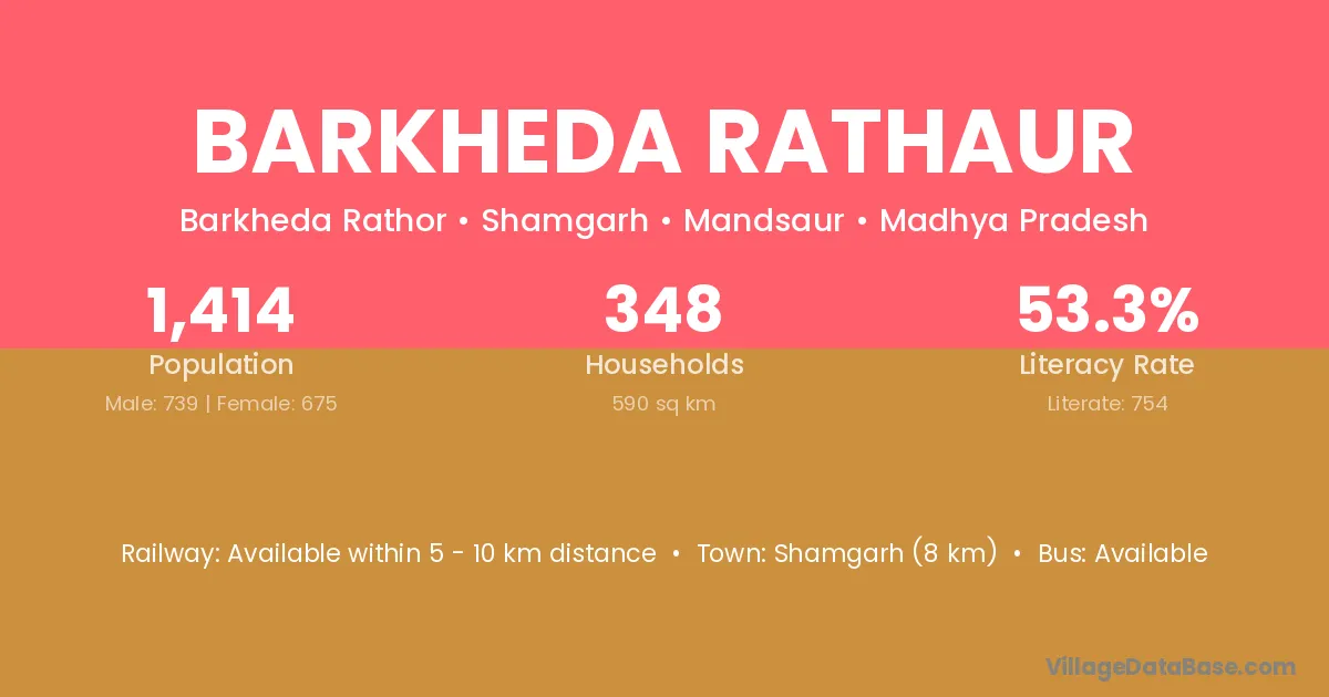 Shamgarh (8 km) is the nearest town to Barkheda Rathaur village for major economic activities and is located approximately 8 km away.