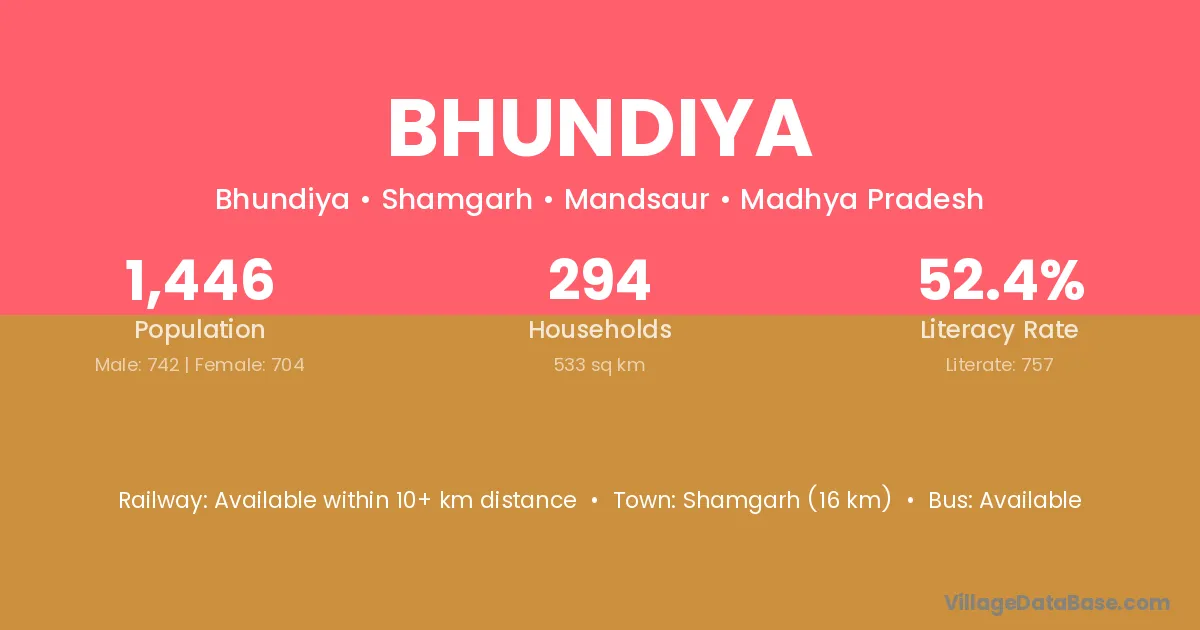 Shamgarh (16 km) is the nearest town to Bhundiya village for major economic activities and is located approximately 16 km away.