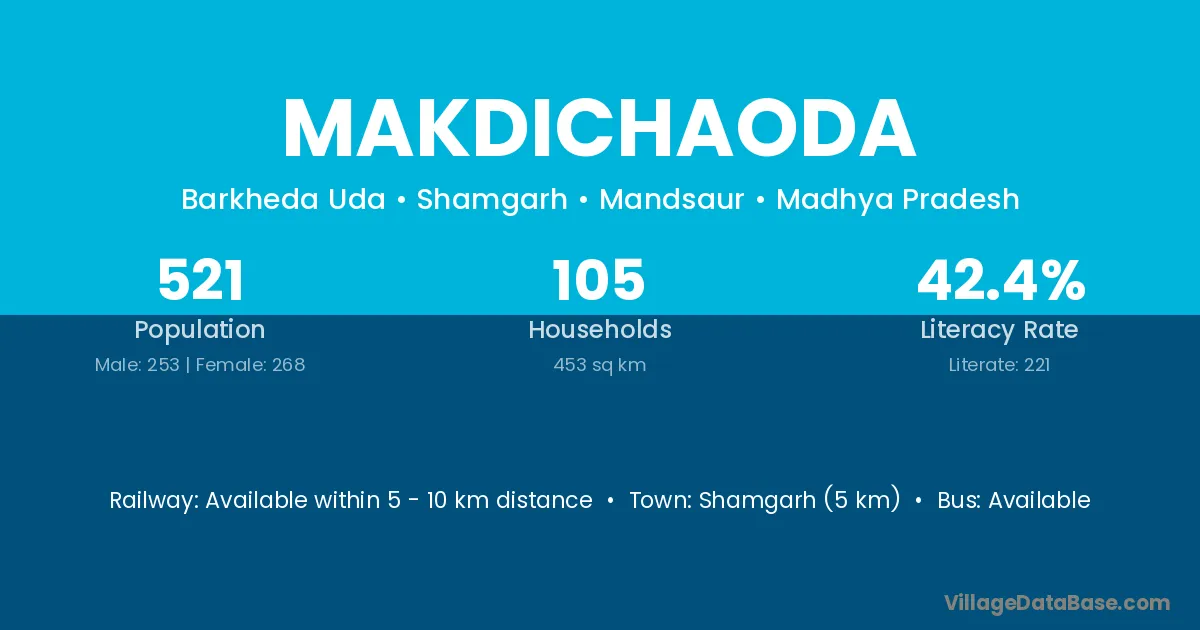 Shamgarh (5 km) is the nearest town to Makdichaoda village for major economic activities and is located approximately 5 km away.