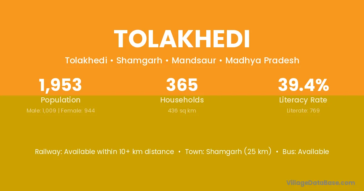 Shamgarh (25 km) is the nearest town to Tolakhedi village for major economic activities and is located approximately 25 km away.