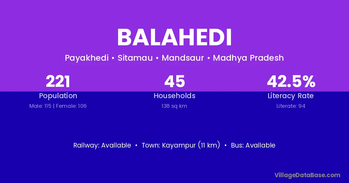 Balahedi village has a total population of 221 people, of which 115 are males and 106 are females.