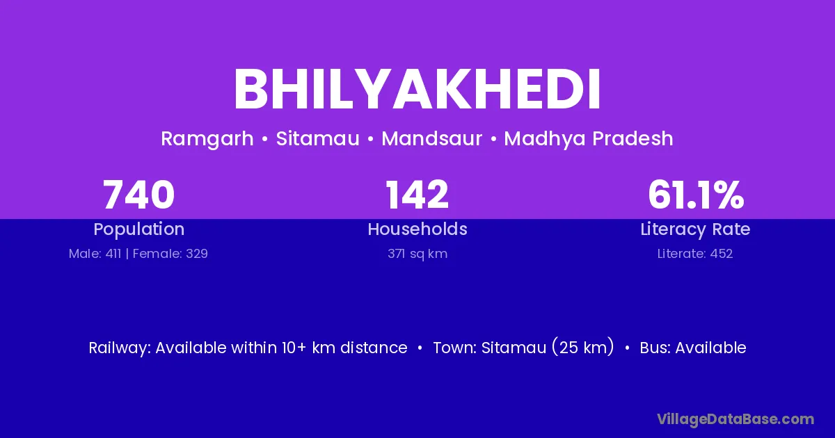Sitamau (25 km) is the nearest town to Bhilyakhedi village for major economic activities and is located approximately 25 km away.