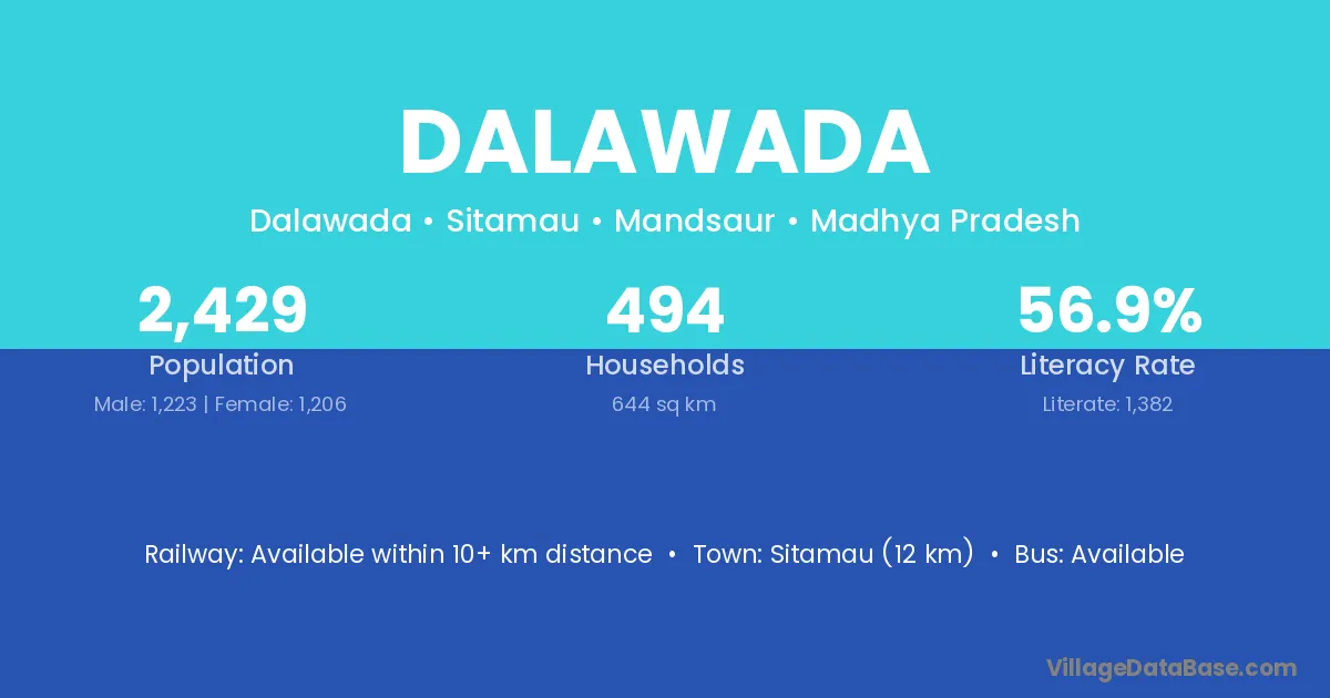 Sitamau (12 km) is the nearest town to Dalawada village for major economic activities and is located approximately 12 km away.