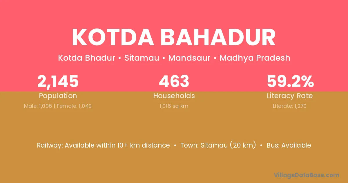 Sitamau (20 km) is the nearest town to Kotda Bahadur village for major economic activities and is located approximately 20 km away.