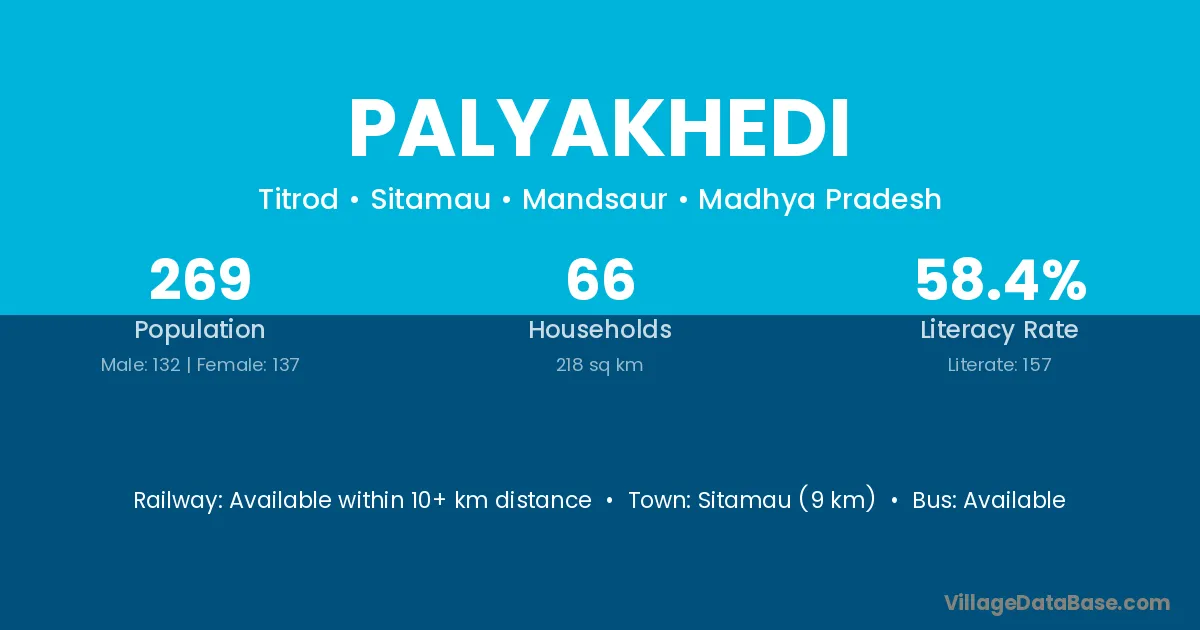 Sitamau (9 km) is the nearest town to Palyakhedi village for major economic activities and is located approximately 9 km away.