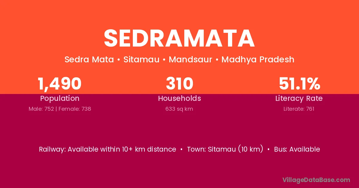 Sitamau (10 km) is the nearest town to Sedramata village for major economic activities and is located approximately 10 km away.