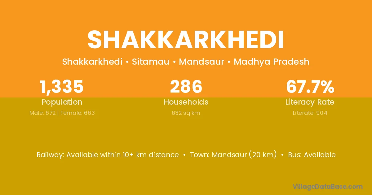 Shakkarkhedi village has a total population of 1,335 people, of which 672 are males and 663 are females.