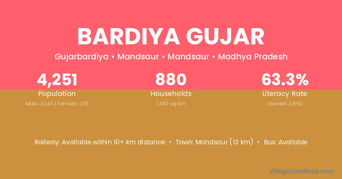 Suwasara (8 km) is the nearest town to Bardiya Gujar village for major economic activities and is located approximately 8 km away.