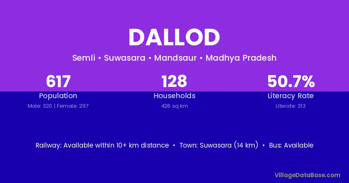 Suwasara (14 km) is the nearest town to Dallod village for major economic activities and is located approximately 14 km away.