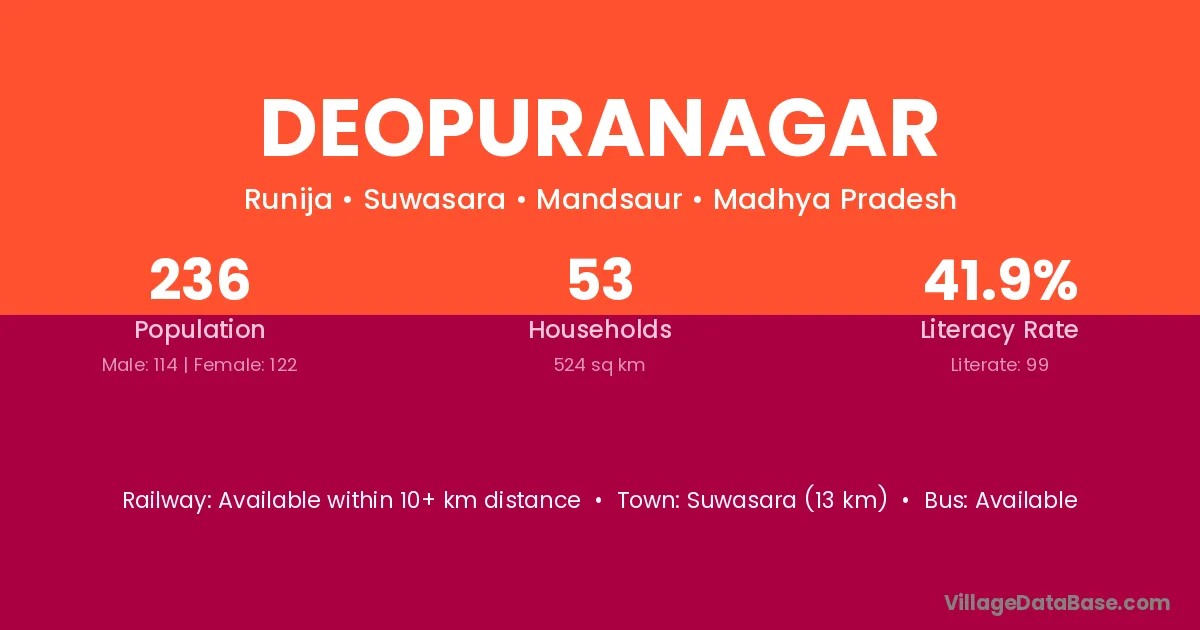 Suwasara (13 km) is the nearest town to Deopuranagar village for major economic activities and is located approximately 13 km away.