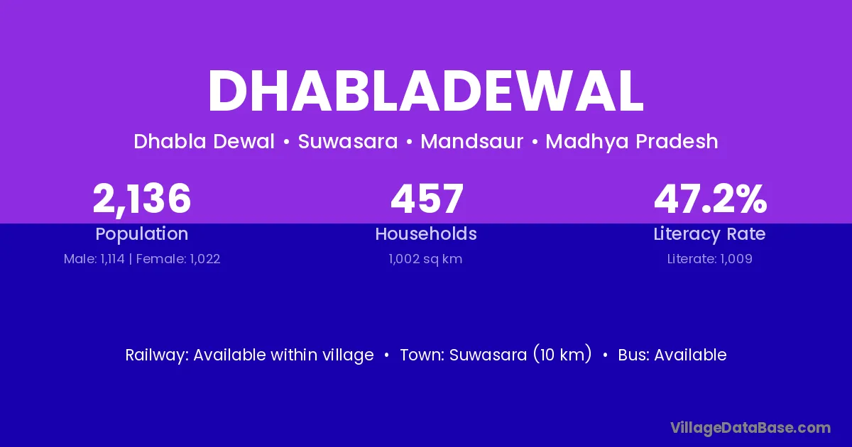 Suwasara (10 km) is the nearest town to Dhabladewal village for major economic activities and is located approximately 10 km away.