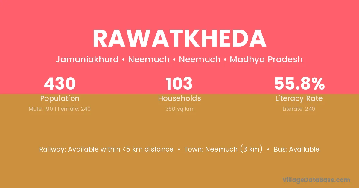 Suwasara (17 km) is the nearest town to Rawatkheda village for major economic activities and is located approximately 17 km away.