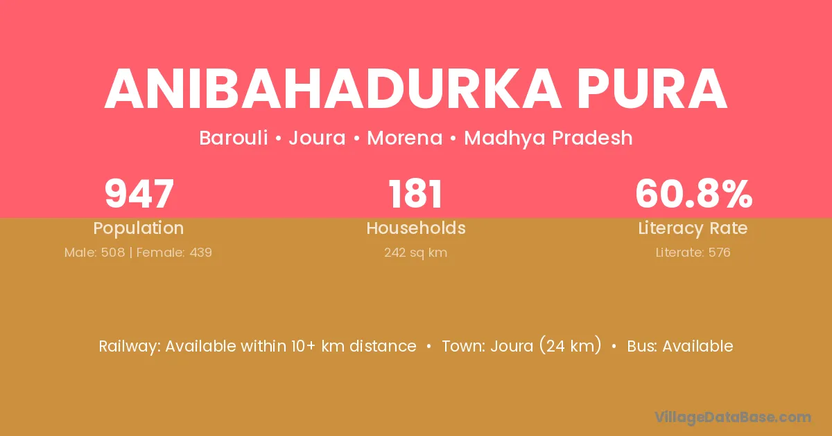 Joura (24 km) is the nearest town to Anibahadurka Pura village for major economic activities and is located approximately 24 km away.