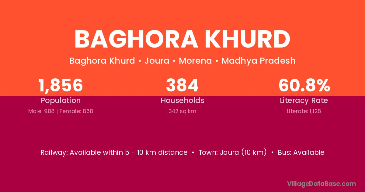 Joura (10 km) is the nearest town to Baghora Khurd village for major economic activities and is located approximately 10 km away.