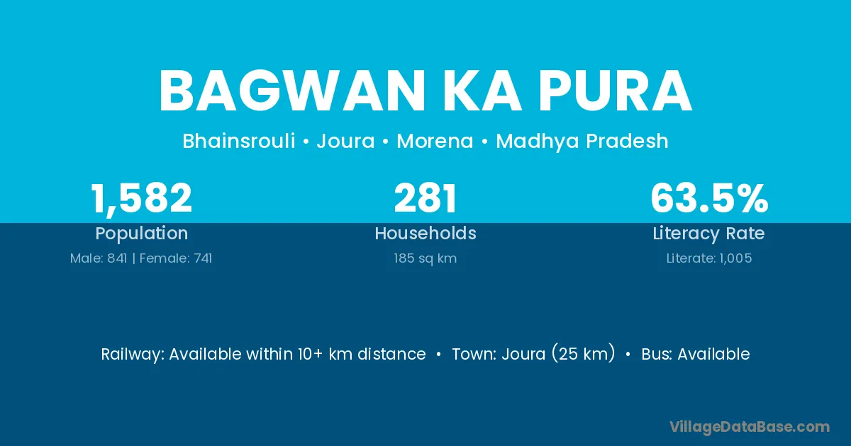 Joura (25 km) is the nearest town to Bagwan Ka Pura village for major economic activities and is located approximately 25 km away.