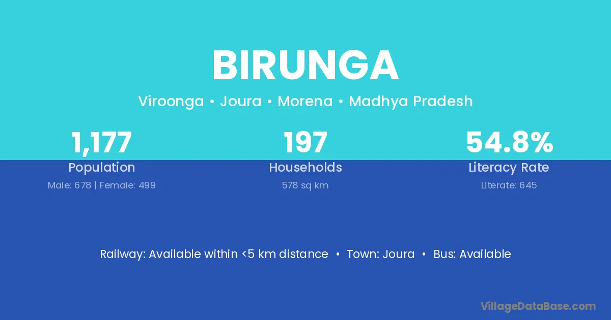 Birunga village has a total population of 1,177 people, of which 678 are males and 499 are females.