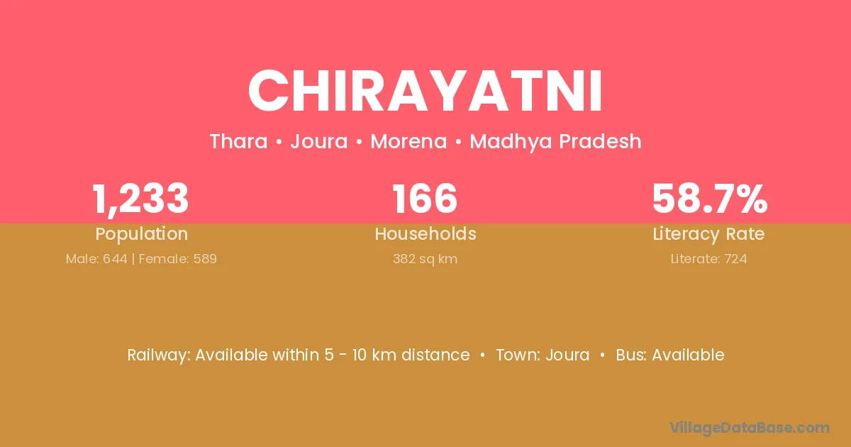 Chirayatni village has a total population of 1,233 people, of which 644 are males and 589 are females.