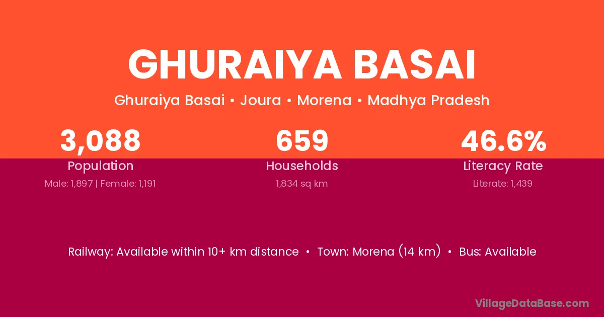 Morena (14 km) is the nearest town to Ghuraiya Basai village for major economic activities and is located approximately 14 km away.