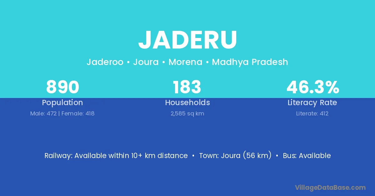 Jaderu village has a total population of 890 people, of which 472 are males and 418 are females.
