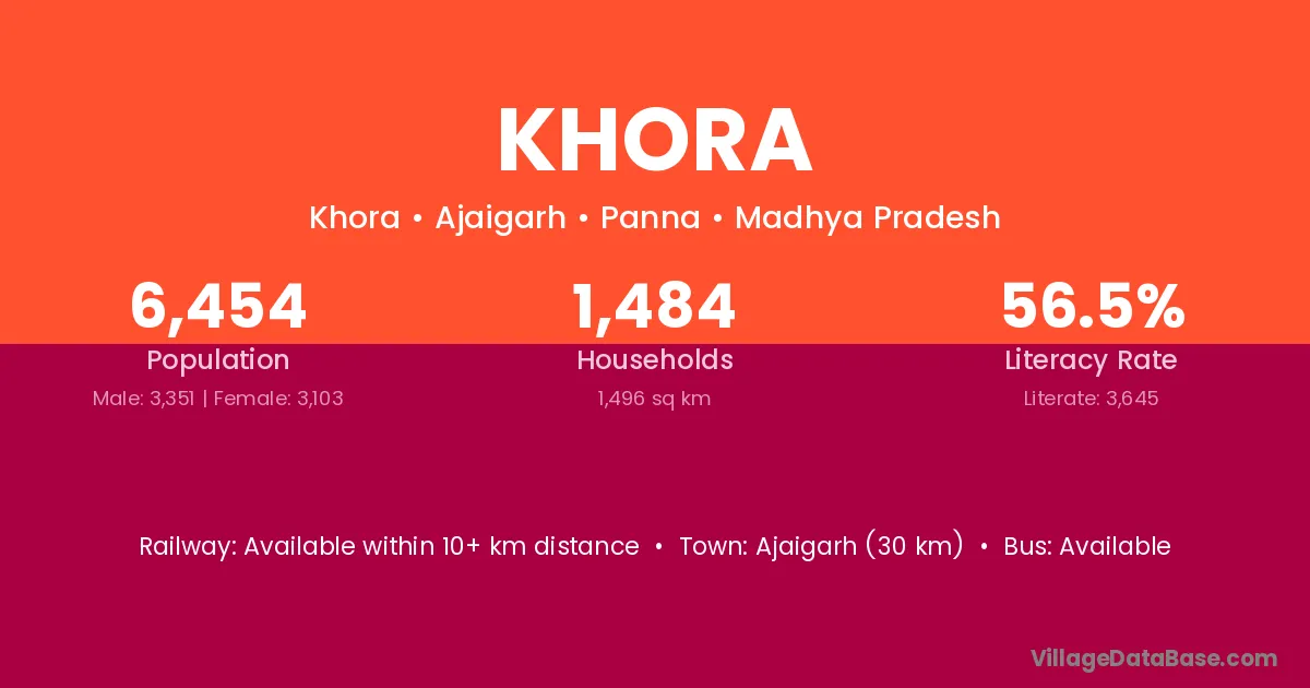 The literacy rate of Khora village is 44.62%. Male literacy stands at 56.65% and female literacy at 31.98%.