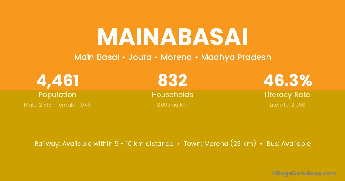 Morena (23 km) is the nearest town to Mainabasai village for major economic activities and is located approximately 23 km away.