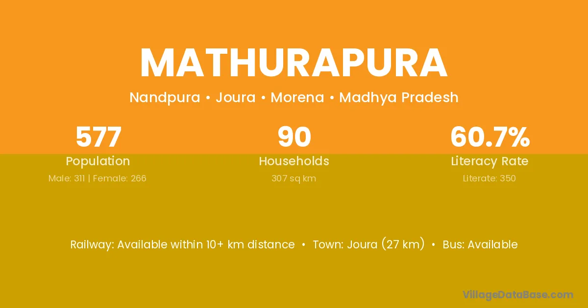 Joura (27 km) is the nearest town to Mathurapura village for major economic activities and is located approximately 27 km away.