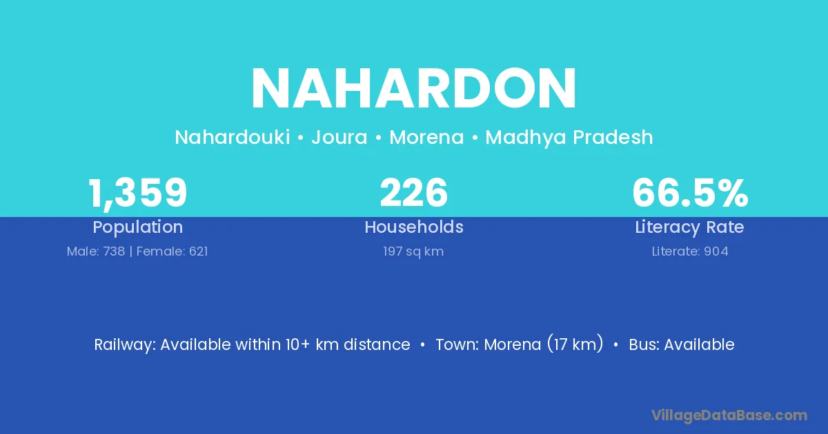 Morena (17 km) is the nearest town to Nahardon village for major economic activities and is located approximately 17 km away.