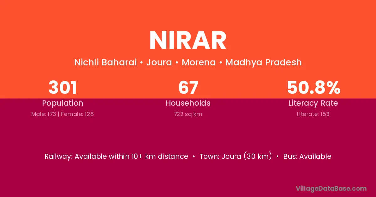 Nirar village has a total population of 301 people, of which 173 are males and 128 are females.