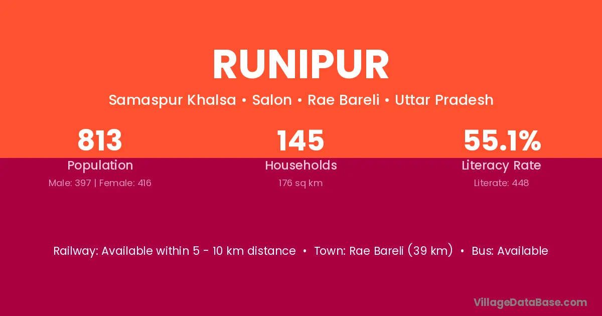The literacy rate of Runipur village is 54.74%. Male literacy stands at 73.37% and female literacy at 32.21%.