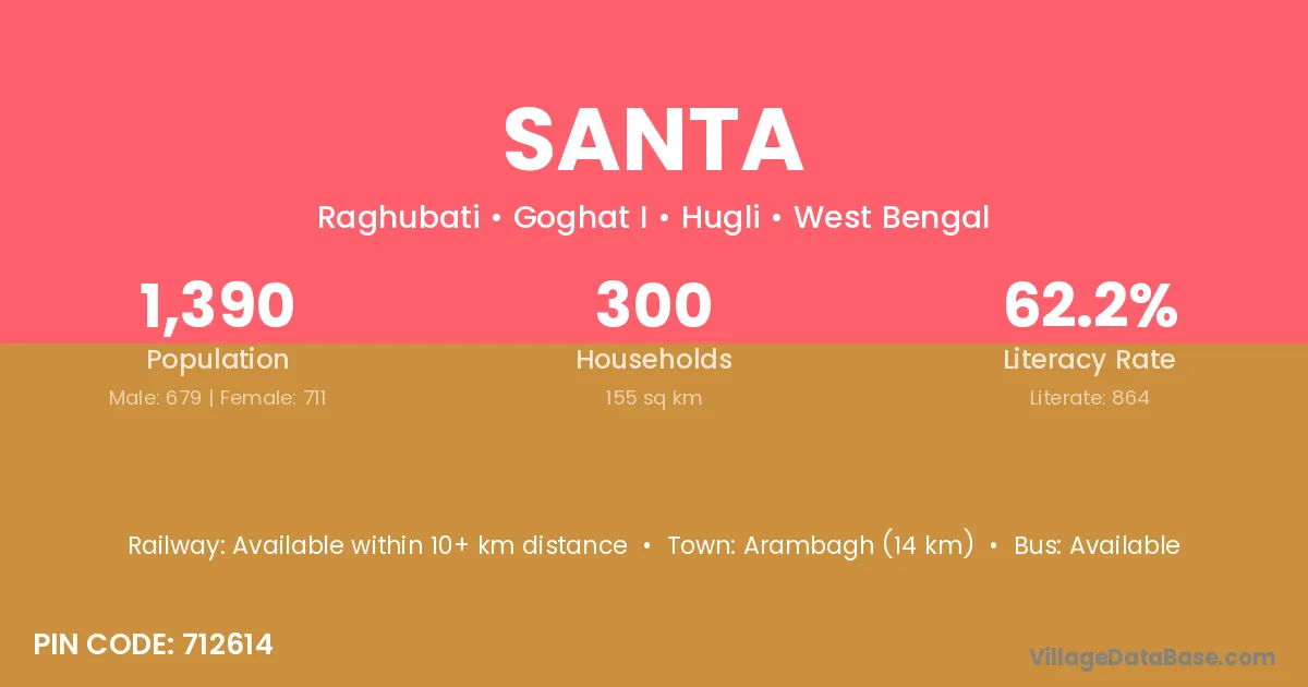 The literacy rate of Santa village is 70.29%. Male literacy stands at 80.58% and female literacy at 58.12%.