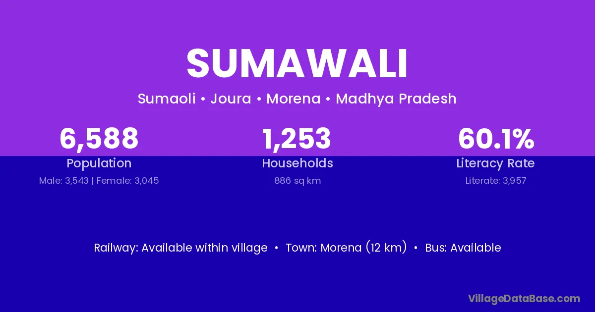 Morena (12 km) is the nearest town to Sumawali village for major economic activities and is located approximately 12 km away.