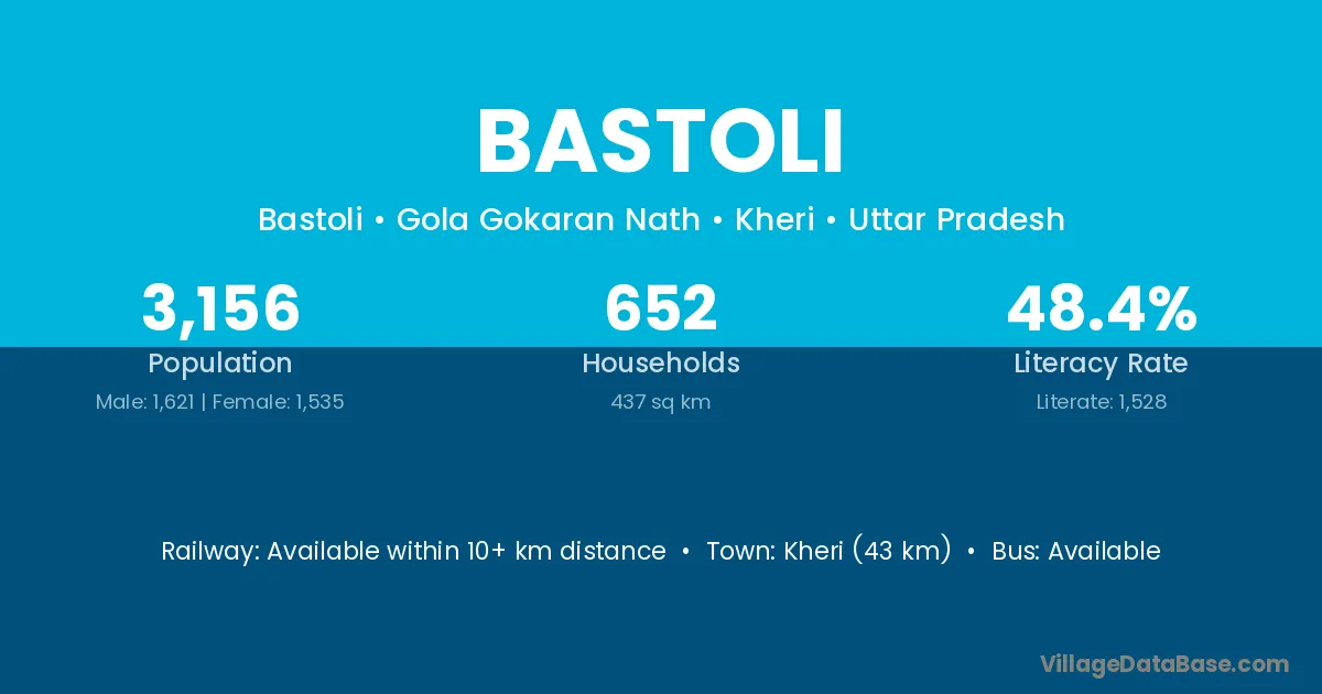 The literacy rate of Bastoli village is 57.09%. Male literacy stands at 71.89% and female literacy at 39.94%.