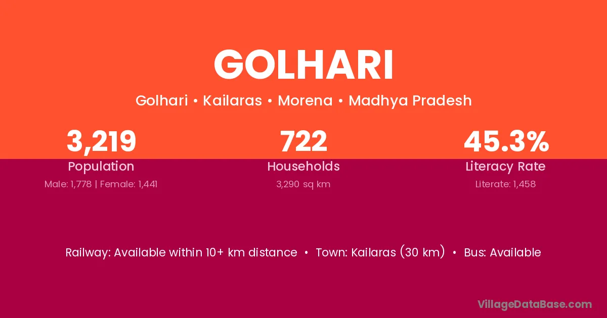 Golhari village has a total population of 3,219 people, of which 1,778 are males and 1,441 are females.