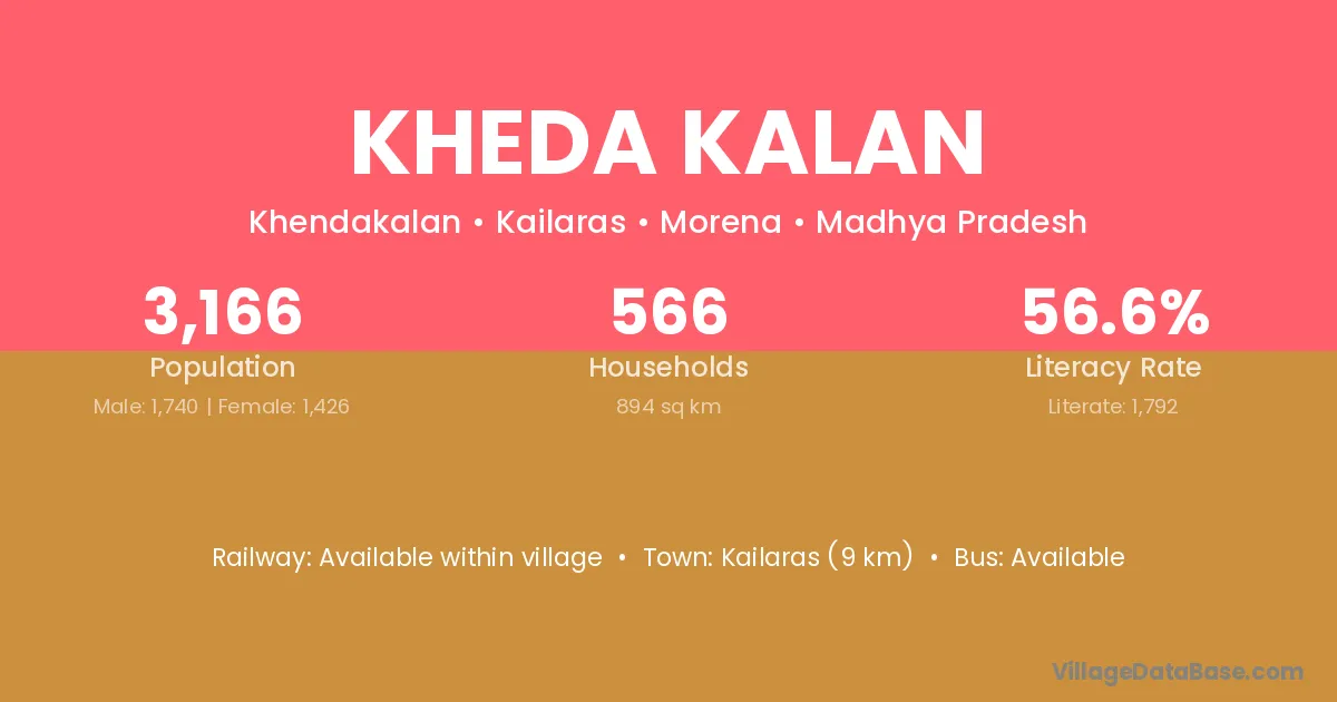 Kheda Kalan village has a total population of 3,166 people, of which 1,740 are males and 1,426 are females.