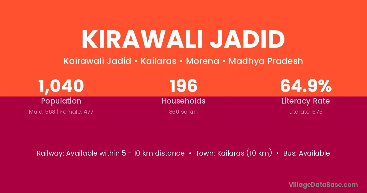 Kirawali Jadid village has a total population of 1,040 people, of which 563 are males and 477 are females.