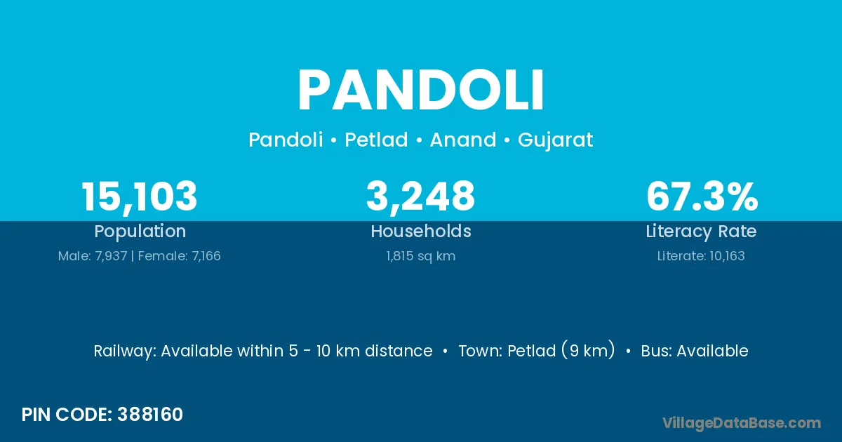 The literacy rate of Pandoli village is 52.72%. Male literacy stands at 64.37% and female literacy at 38.71%.