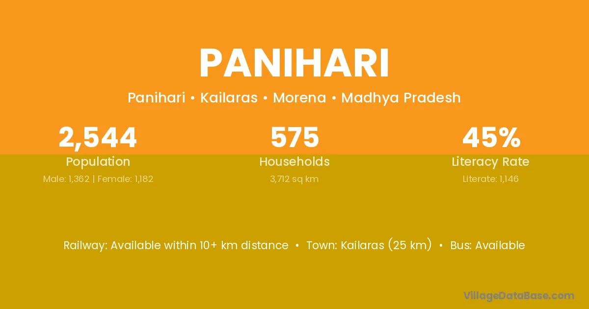 Kailaras (25 km) is the nearest town to Panihari village for major economic activities and is located approximately 25 km away.