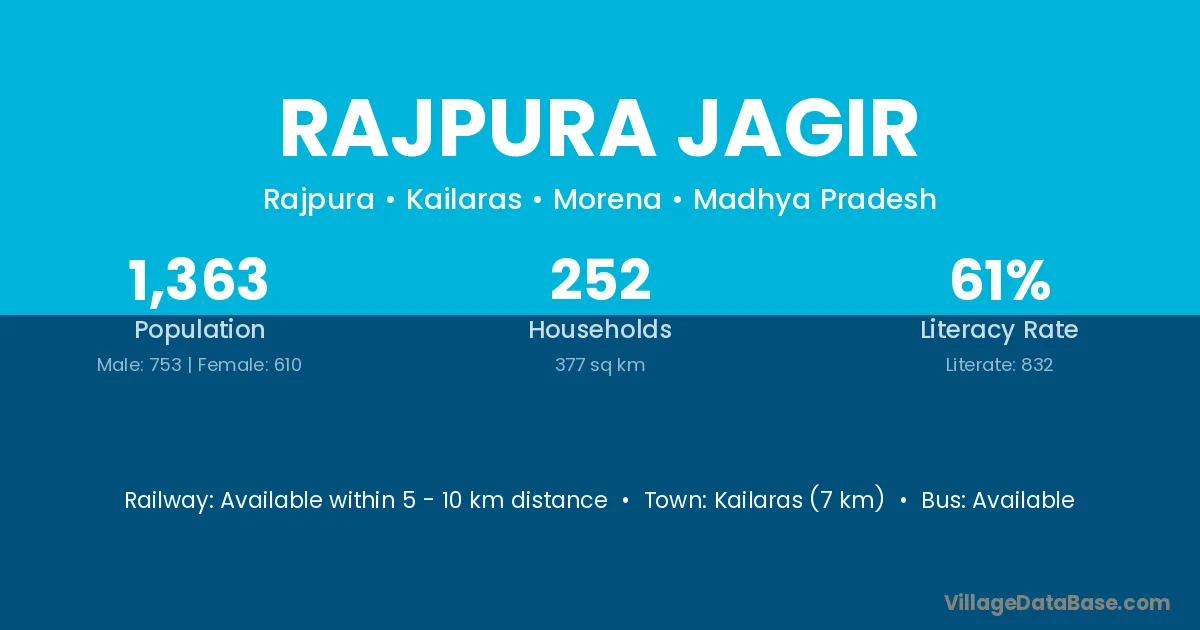 Rajpura Jagir village has a total population of 1,363 people, of which 753 are males and 610 are females.